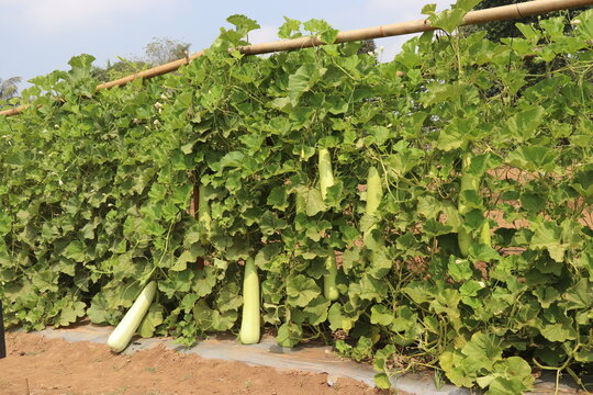 Bottle gourd plant with bottle gourd hanging in agricultural farm. Long winter melon called as calabash or lagenaria siceraria grown on horticultural farms