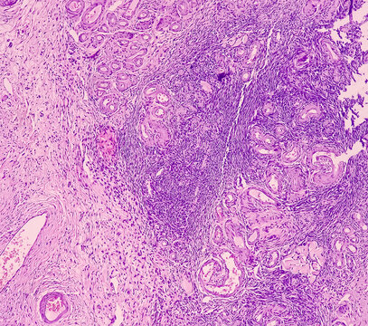 Photo of benign brenner tumor of ovary, showing tumor sheet on the right side and ovarian stroma on the right side.
