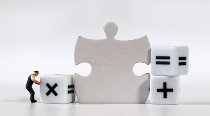 white dice with mathematical math symbols and miniature man