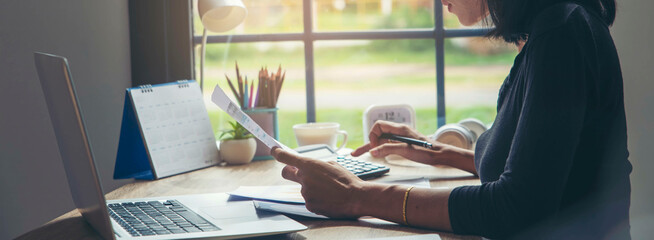 Business concept, Businesswoman reading document and use calculator to calculate investment budget