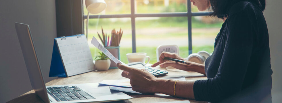 Business and Financial Planning Concept. Financial advisor plan, use calculator to calculate budget, work on laptop. Professional Businesswoman discusses and analysis annual report at home office.