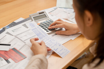 Financial owe asian young woman, girl suffer, stressed and confused, hand use calculator calculate expense from invoice or bill, have no money to pay, mortgage or loan. Debt, bankruptcy or bankruptcy.