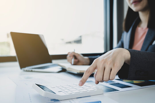Businesswomen or Accountants use a calculator to doing income-expense accounting and analyze company financial reports. investment, balance sheets, taxes, planning and business strategies concept.