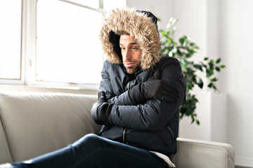 A Man have cold on the sofa at home with winter coat
