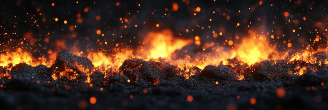 Abstract volcanic landscape with molten lava and fiery particles in darkness