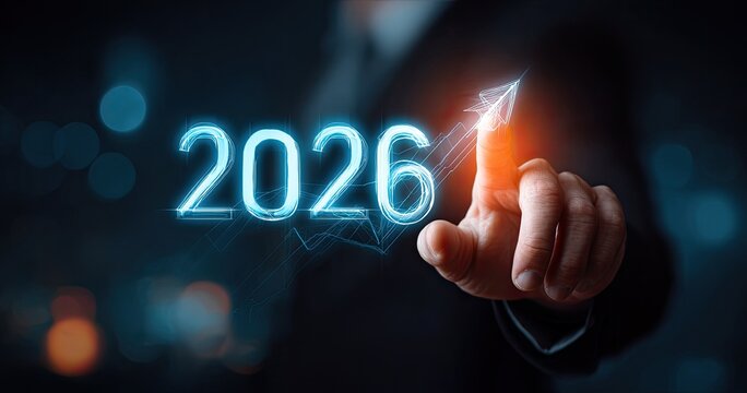 Person touching a futuristic glowing 2026 with rising arrow