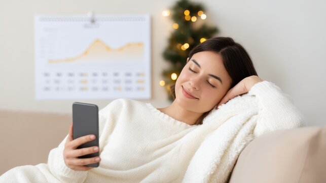 A young woman relaxes comfortably on a sofa, using her smartphone with a serene expression. A calendar featuring graphs hangs in the background, adding a touch of modernity.