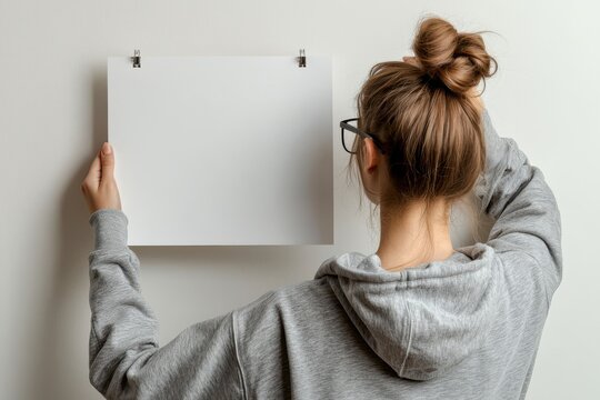 Woman in casual hoodie hangs an empty white calendar on the wall for planning or decoration purposes