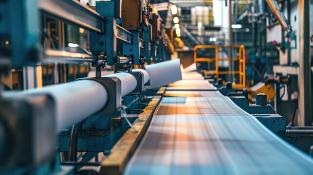 Industrial paper processing line with machinery printing or processing large rolls of paper in a factory setting.