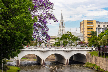 Beautiful church with a spring view, colorful trees and a river running through the city