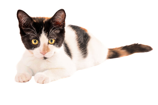 Calico cat lying on soft surface, displaying curiosity and playfulness