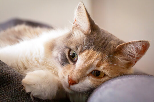 Calico cat rests peacefully on white background. Adorable pet with orange white, black fur. Tranquil scene perfect for pet lovers. Animal portrait ideal for domestic animal sites pet supply stores.