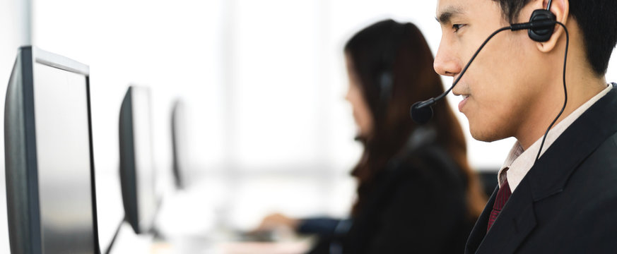 Happy call center smiling asian businessman operator customer support consult phone services agen working with wireless headset microphone and computer at call center office