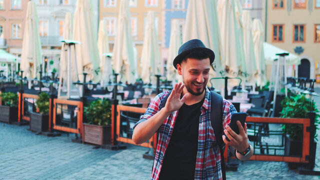 Handsome tourist making video call on smartphone and showing his place of visit. Sightseeing in beautiful european city.