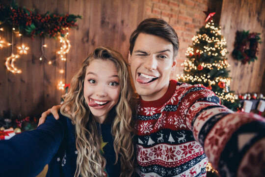 Photo of young couple take selfie photo playful stick tongue out wear christmas clothes cozy x-mas party decoration interior flat indoors