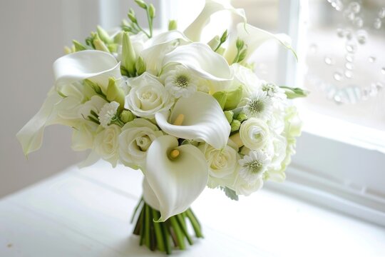 White Floral Arrangement for Wedding Day. Elegant Bouquet with Calla Lilies and Roses