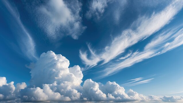 Fluffy clouds on clear blue sky, calm and sunny atmosphere