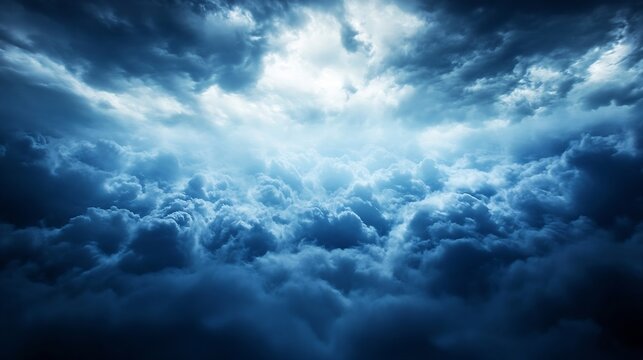 Sun rays piercing dramatic cumulus clouds in blue sky