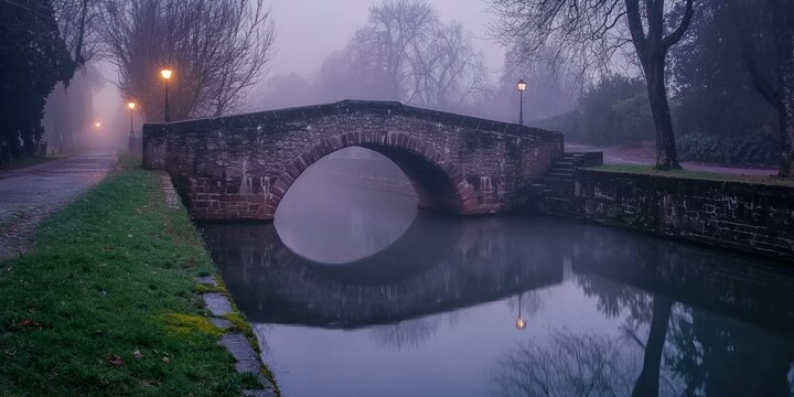 A beautiful scenic and postcard shot of a bridge crossing over the Leeds to Liverpool Canal, the reflection of the bridge clearly visible in the water.