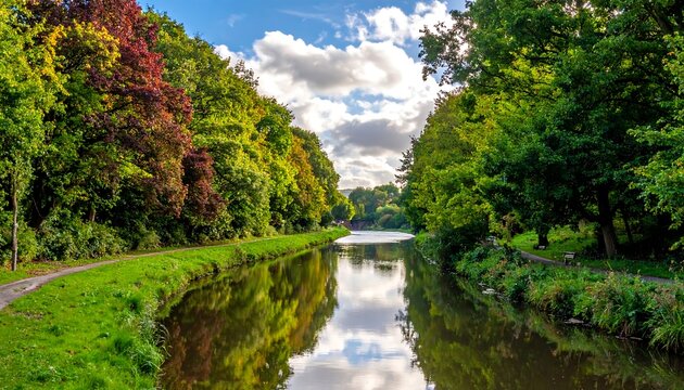 A small bridge arches over the Grand Union Canal in Milton Keynes, surrounded by lush greenery