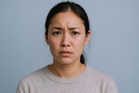 Portrait of an Asian woman with skeptical serious facial expression on plain background.