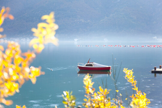 Autumn landscape with boat. Branch of yellow and orange leaves. Foggy morning lake. Amazing nature with mountains, silence, calmness. Still water of Kotor Bay, Montenegro.