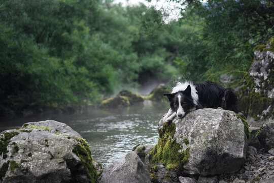 A Border Collie lies on a rock by a calm forest river, with lush greenery in the background. The dog's relaxed posture and peaceful setting highlight the serenity of the natural landscape.