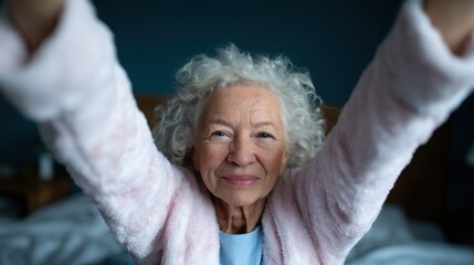 An elderly woman with curly hair joyfully reaching for the camera, showcasing a warm smile and an excited demeanor in a cozy indoor setting with a calming background.