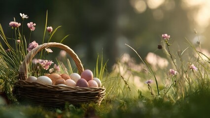 Sunlit grassy park with lush trees and a soft bokeh background.