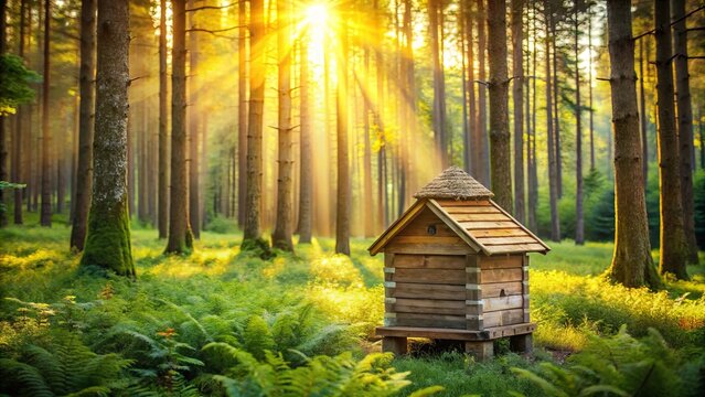 Golden sunlight streams through a tranquil forest, illuminating a rustic wooden beehive nestled amongst lush ferns.