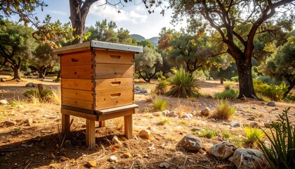 Honeycomb overflowing from wooden beehive in a sunlit forest