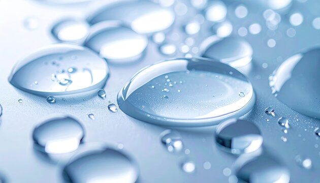 Macro photograph of clear water droplets on a smooth reflective surface with soft blue lighting creating a calming and clean aesthetic