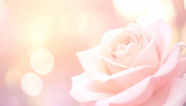 Delicate pink rose bloom with soft warm bokeh lights background.