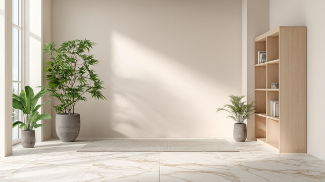 Stylish minimal interior room showcases a bright, calming space with natural light, plants, and modern shelving, perfect for home decor or real estate design.