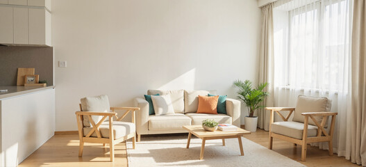 Bright, airy living space with neutral tones, natural light, and minimalist furniture creating a calming atmosphere.