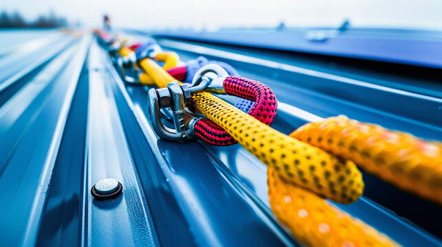 Various colorful climbing ropes and outdoor gear neatly organized on a wall, showcasing equipment for rock climbing and adventure sports.