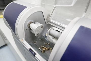 CAD CAM dental computer-aided machine in a highly modern dental laboratory for prosthesis and crowns milling. Dentistry, prostodontics, prosthetics and medical computer technology concept