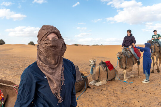 Happy tourist having fun enjoying group camel ride tour in the desert - Travel, life style, vacation activities and adventure concept