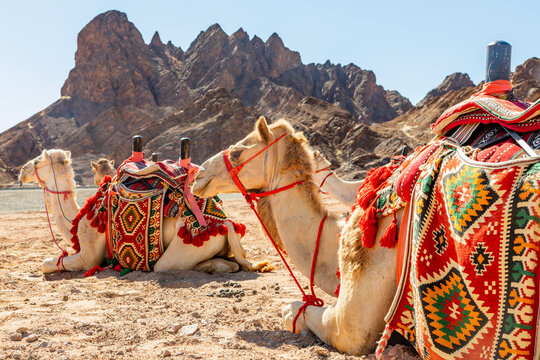 Harnessed riding camels resting in the desrt, Al Ula, Saudi Arabia