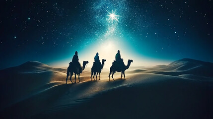 silhouette of four of the Magi is riding camels in the desert at sunset