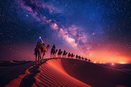 People riding camels in the desert for travel