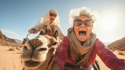 A happy beautiful girl, smiling, takes a selfie with a camel by the road during a trip to the desert, Dubai, UAE