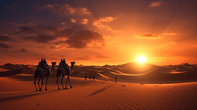Camels in Arab hot sunset landscape desert traveling over the world. Beautiful scenery background copy space banner.