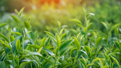 Green tea tree leaves field Fresh young tender bud herbal in farm on summer morning. Sunlight Green tea tree plant camellia sinensis in organic farm. Close up Tree tea plant green nature in morning