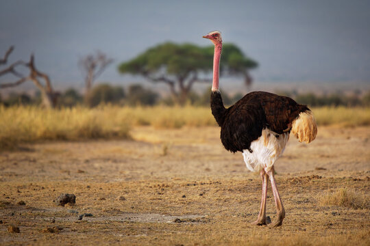 Common Ostrich - Struthio camelus is a species of flightless bird native to large areas of Africa , the largest living bird, long strong red legs, long neck, small head, big bird in savannah