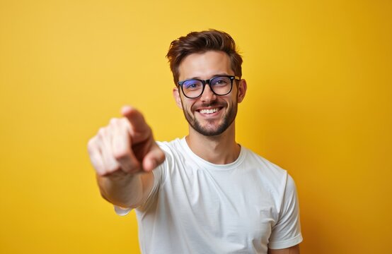Smiling man with beard in glasses, white t-shirt points finger to the camera on yellow background. He selects you. Confident handsome cheerful guy indicates direction. Choice concept.
