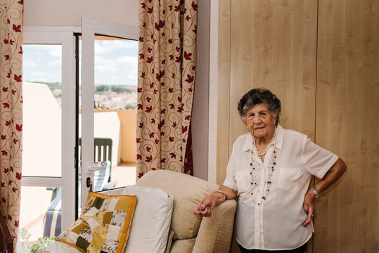 Elderly curly gray haired female in white shirt with hand on waist standing while leaning on armchair at home and looking at camera