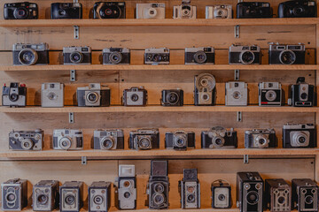 An intricately set up vintage camera collection and photography studio, Antique cameras and darkroom equipment for nostalgic photography, Retro photography style