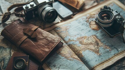 Wanderlust Essentials Passport Camera Map A Vibrant Flat Lay for Travel Enthusiasts