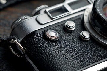 Vintage camera with sleek design and detailed lens, positioned on wooden surface, showcasing craftsmanship and nostalgia, perfect for photography enthusiasts and collectors seeking timeless elegance